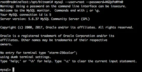 We need to select active database, choose something with word “redmine” in name, for me it “bitnami_redmine” and run command: